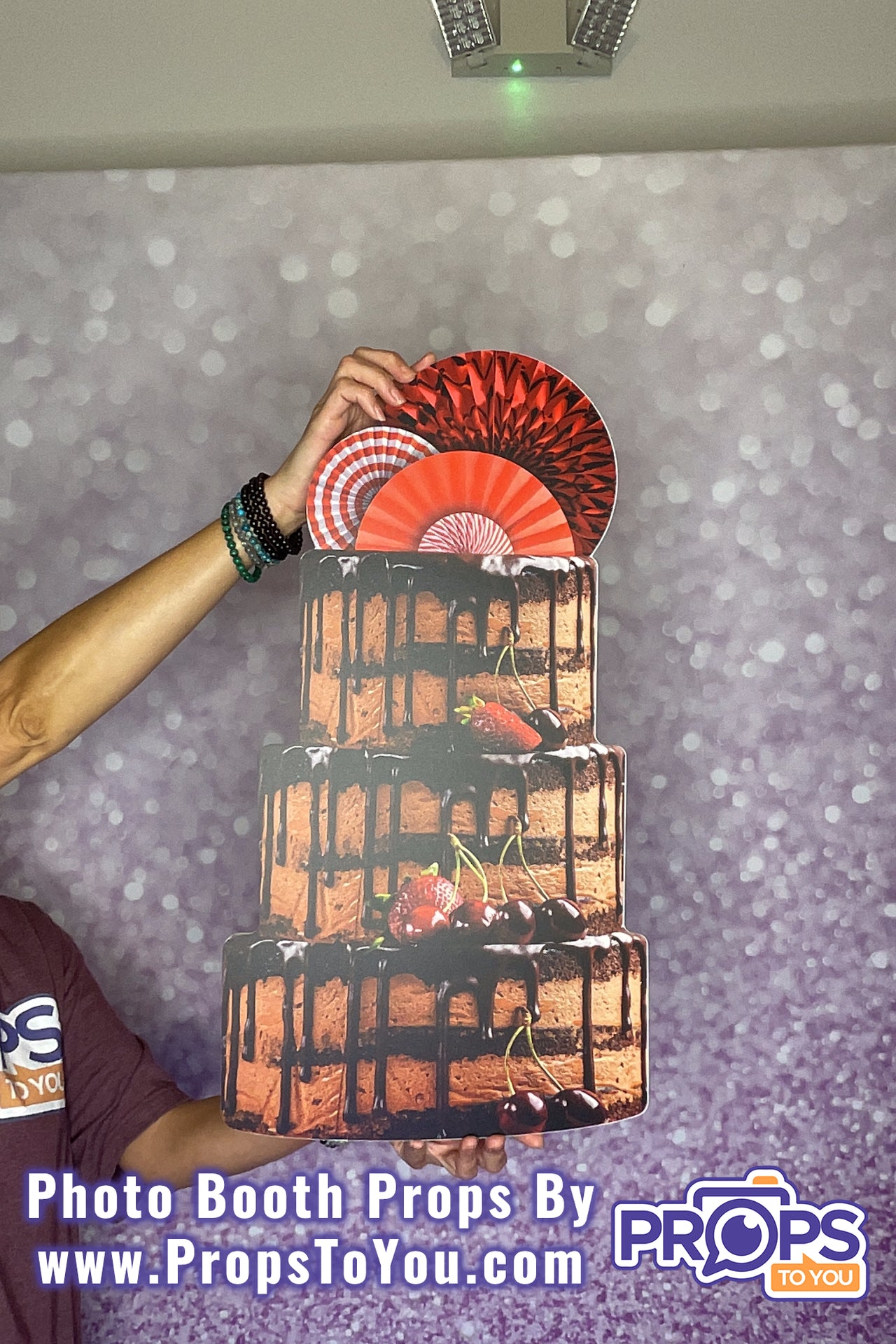 Side two of this photo booth prop is an incredible layered chocolate tiered cake with chocolate ganache, topped with rosette fans and garnished with fresh fruits. I might eat this prop.