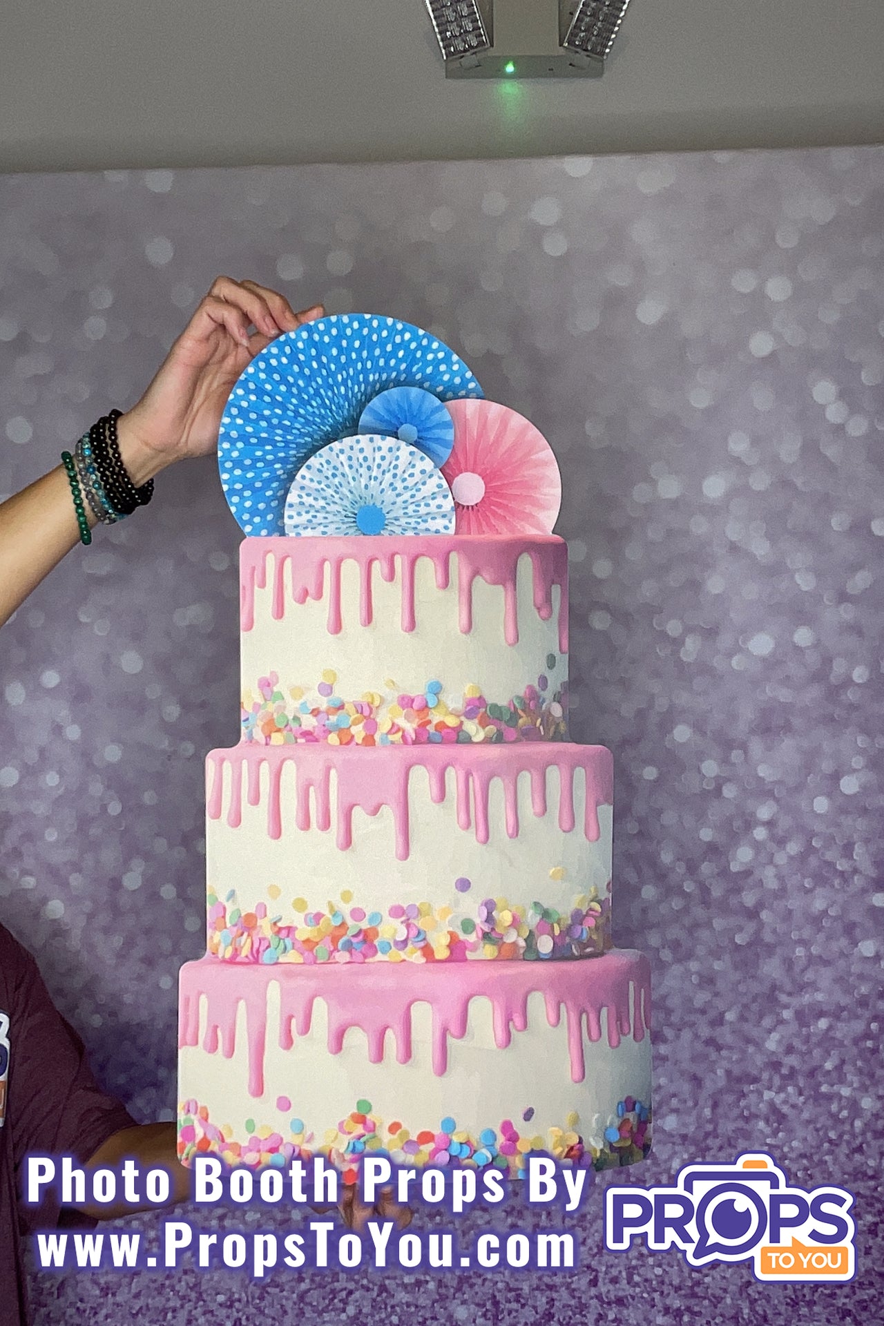 Side one of this deliciously BIG photo booth prop features an over-the-top three-tier vanilla buttercream birthday cake, covered in pink white chocolate ganache and topped with pink and blue rosette fans. EXTRA AF.
