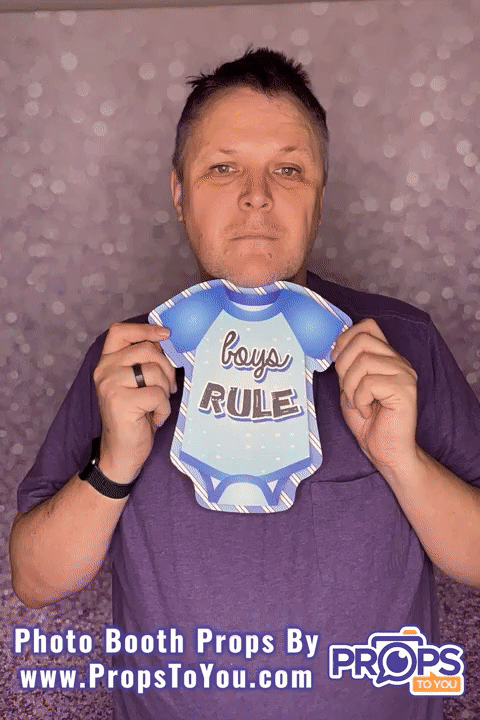 Side two of this photo booth prop features the message "Boys Rule" on a blue onesie.