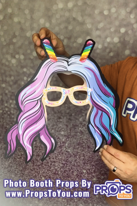 Side one of this photo booth prop features cotton candy hair, and rainbow antennae - with matching sprinkle sugar glasses.