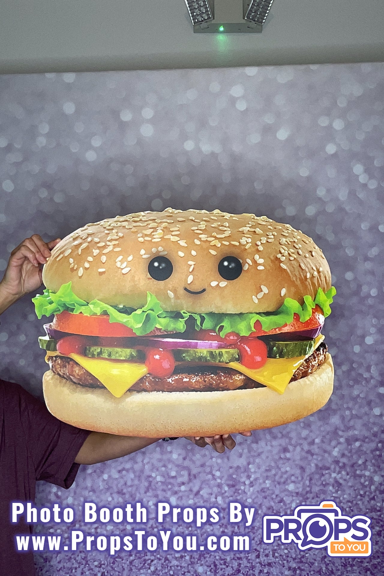 Side one of this deliciously BIG photo booth prop features a juicy cheeseburger covered in the works - plus an adorable face! Aww!
