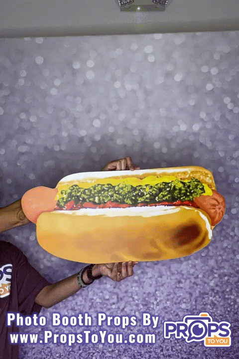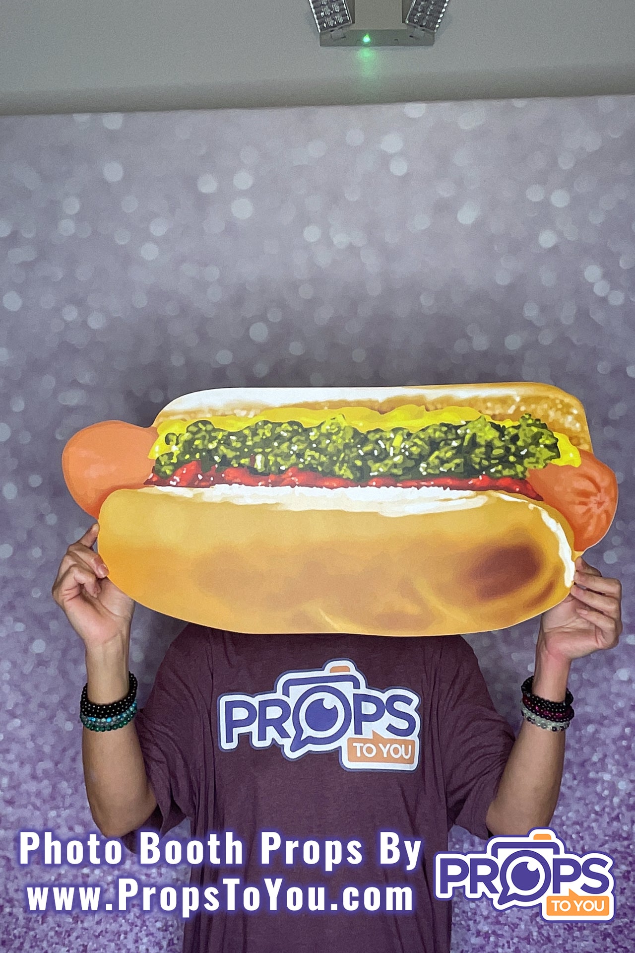 BIG Props: Regular/Chicago Style Hot Dog Photo Booth PropSide one of this deliciously BIG photo booth prop is a juicy hot dog topped with ketchup, mustard, and relish!