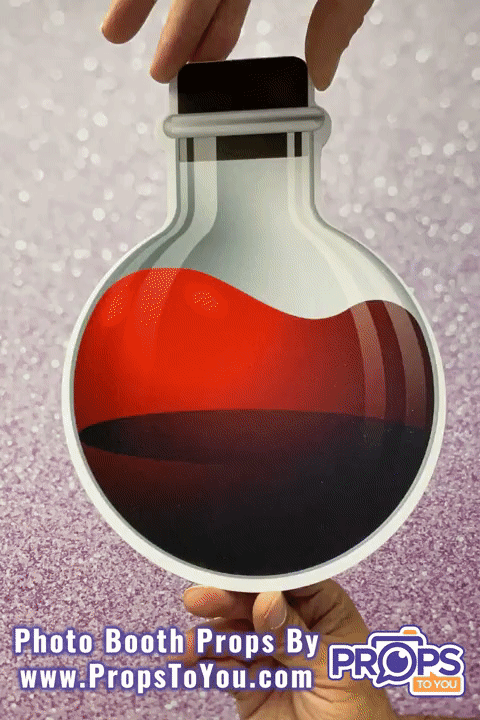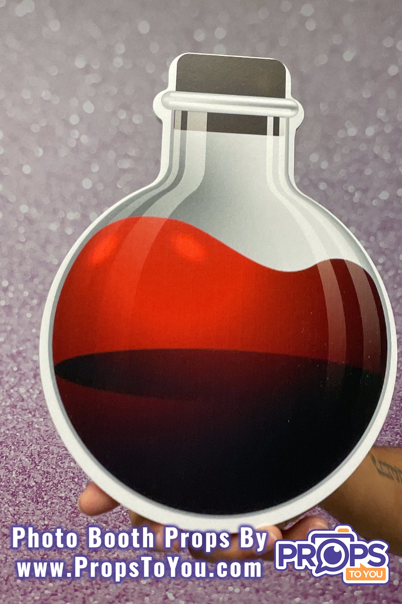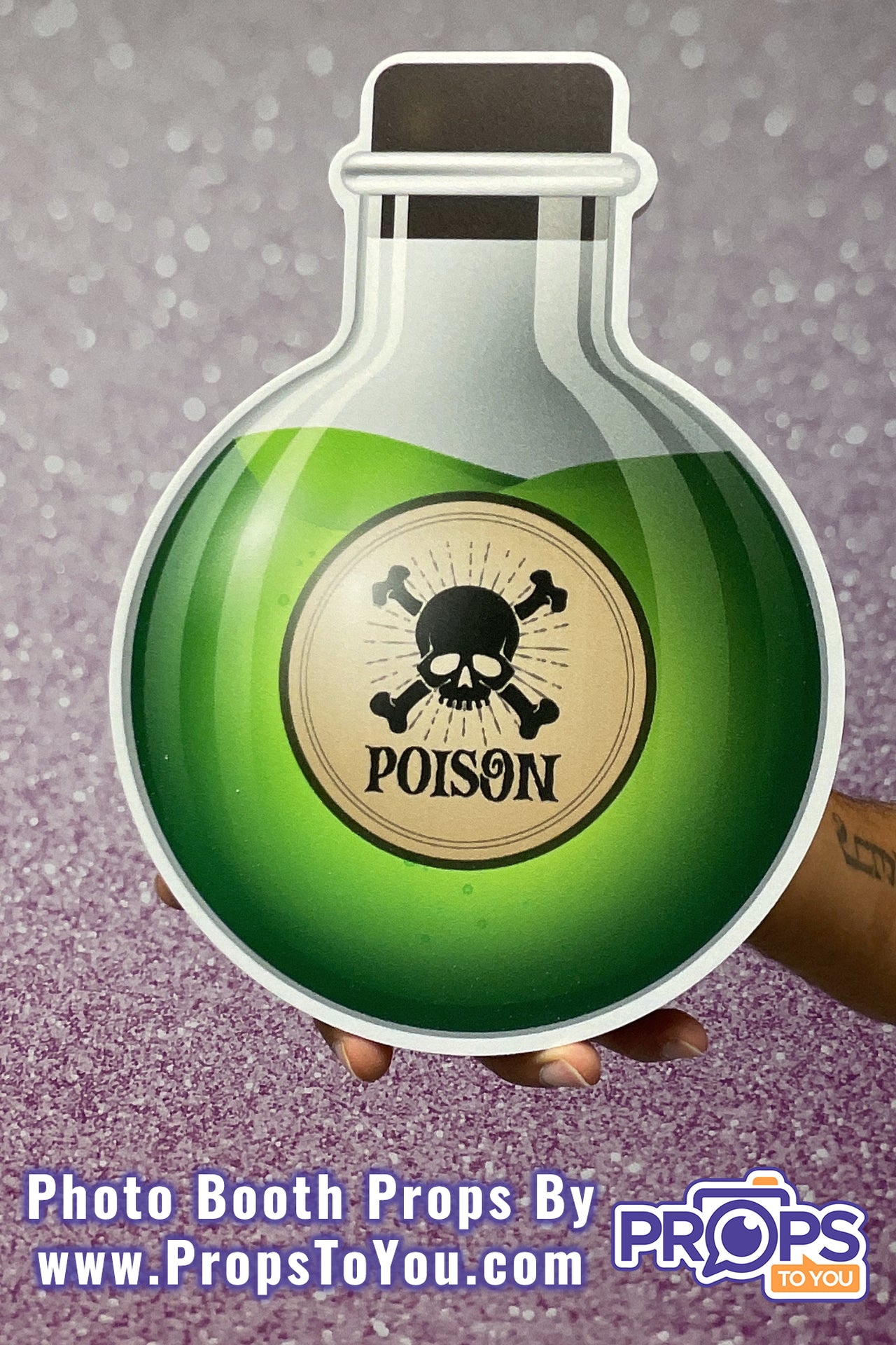 Side one of this photo booth prop features a round green flask labelled "POISON"
