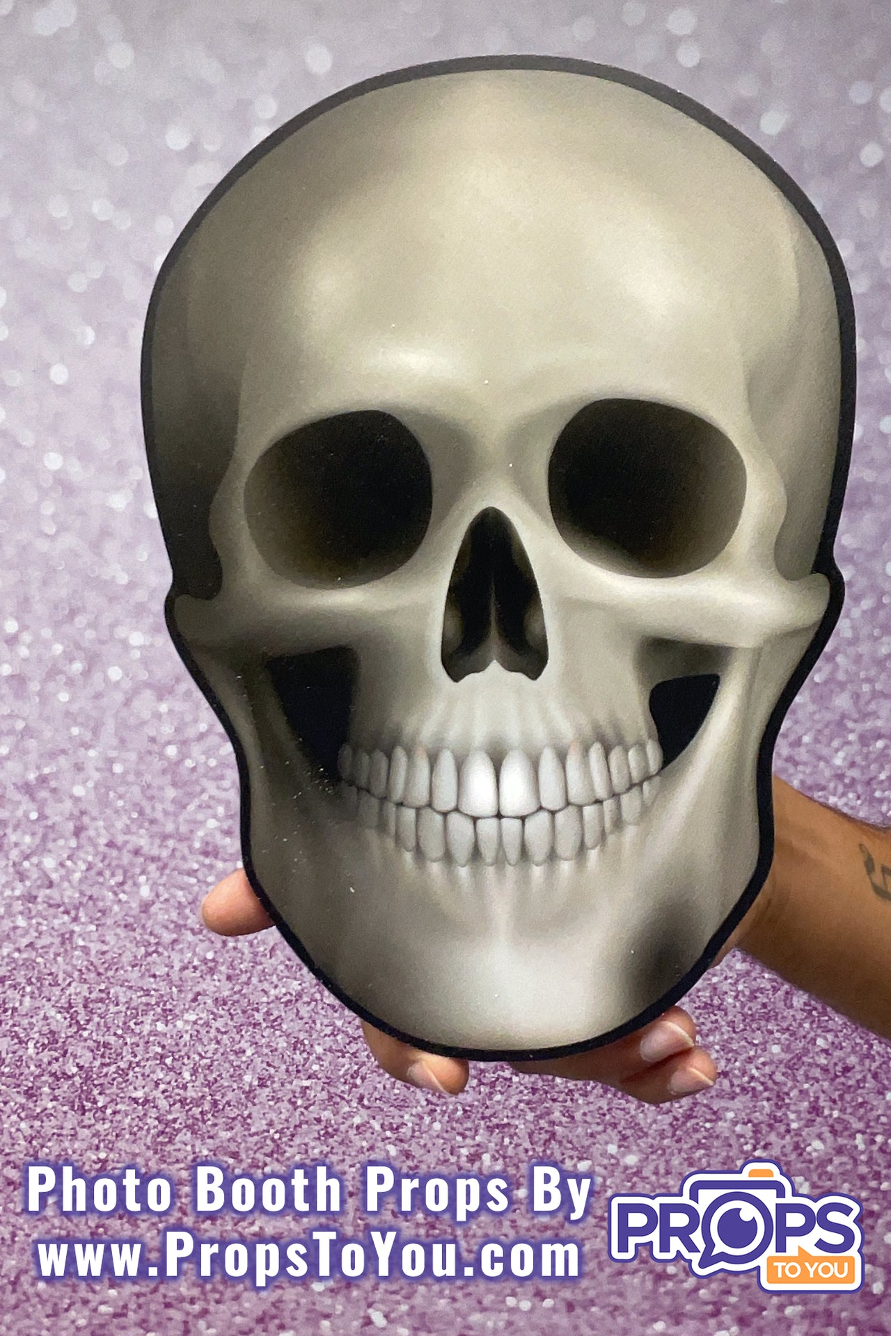 Side two of this photo booth prop features a smiling skull with glowing purple eyes.