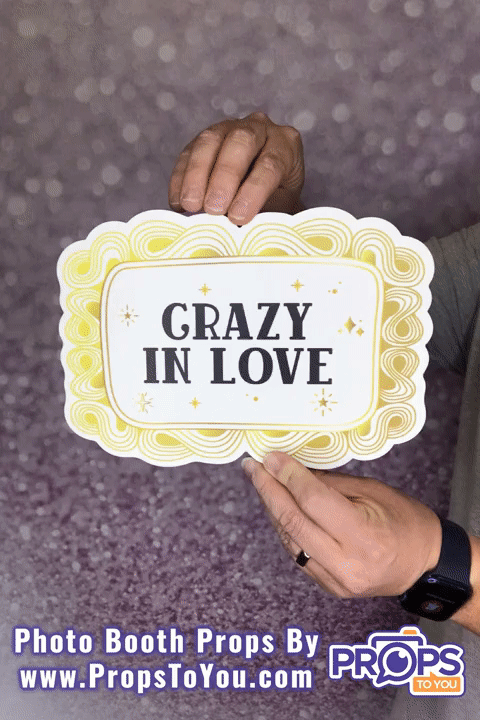 Side two of this photo booth prop features the message "Crazy in Love" in black on a white background, surrounded in golden accents.