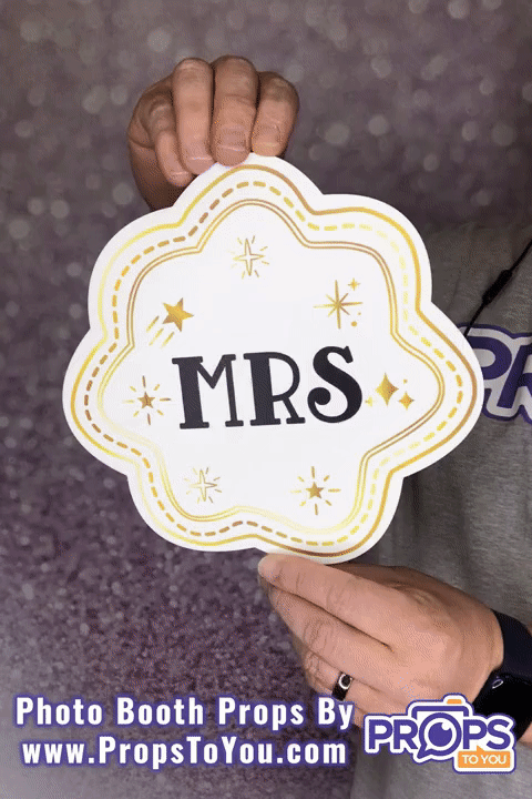 Side two of this photo booth prop features the message "MRS" centered on a white background surrounded in golden accents.