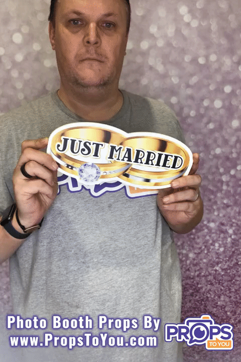 Side one of this photo booth prop features the message "Just Married" across a set of wedding band rings in the theme colors.