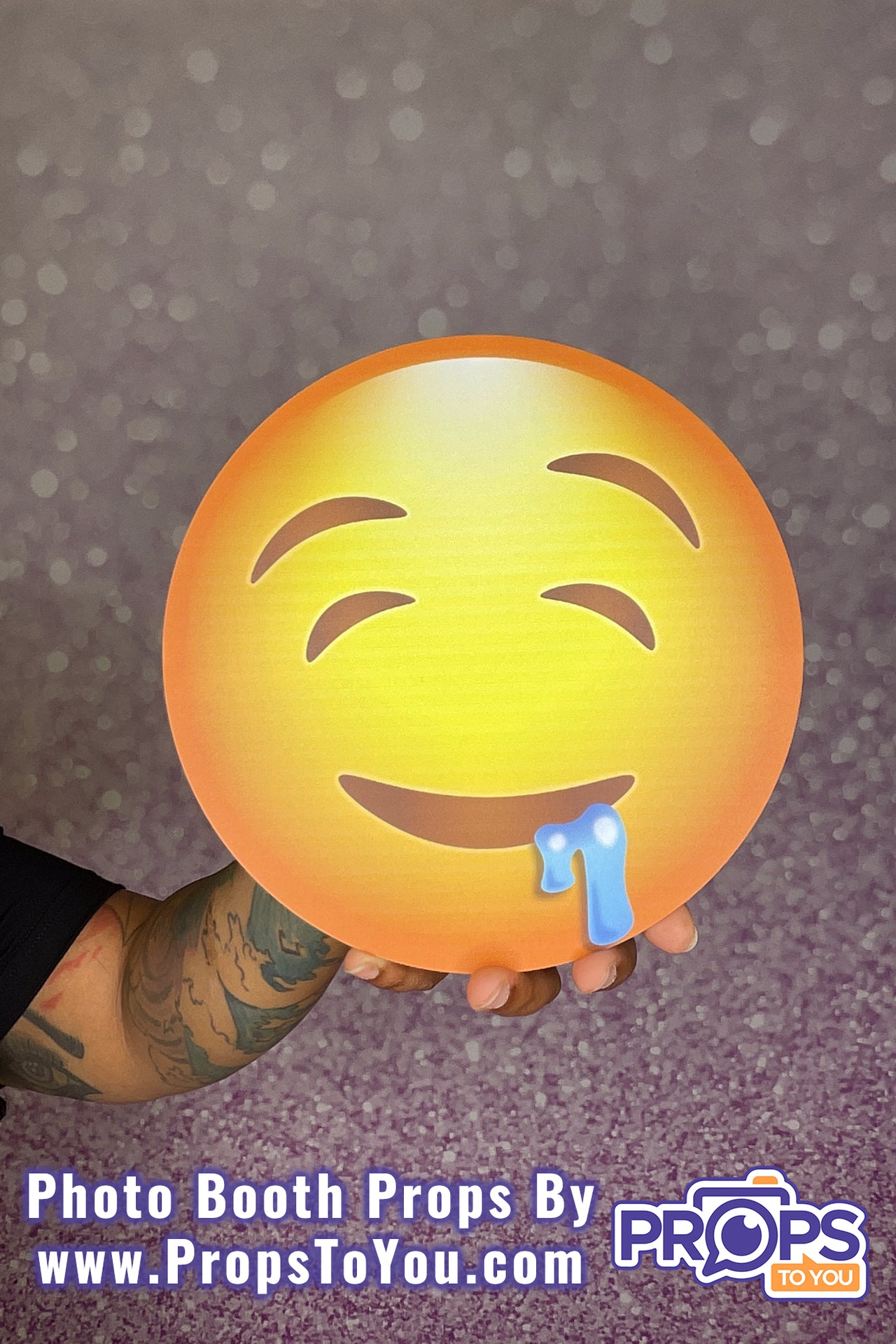 Side one of this photo booth prop features a drooling face with its eyes closed.